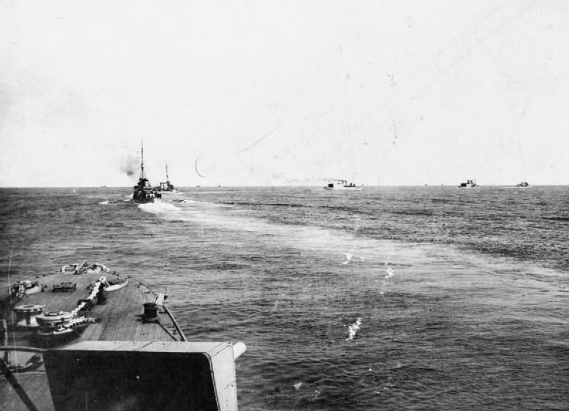 On May 29th, Campania was conducting experiments with the newly-fitted flying-off deck, and the next day, she anchored well away from the rest of the Grand Fleet. For security reasons, all British harbor signalling was visual, and Campania missed the order to sail, only realizing her mistake two and a half hours later when the harbormaster asked when he could close the boom. She set off, but was soon ordered back to port by Jellicoe, who was concerned about the unescorted ship's vulnerability to submarine attack, and didn't believe she could catch up with the fleet in time. Engadine, however, had sailed with Beatty, bearing four planes: two Short 184 two-seat reconnaissance floatplanes, and two Sopwith Baby single-seaters intended to shoot down any marauding Zeppelins.4
