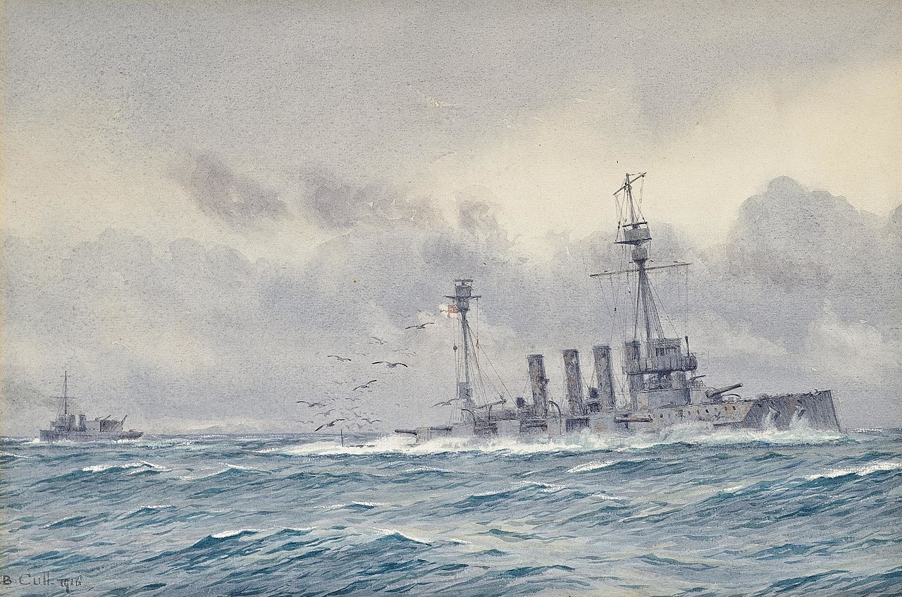 On May 31st, Engadine was the lead ship of the entire British fleet, 4 miles ahead of the scouting line of light cruisers. This seems odd, but it was a consequence of the need for the ship to stop and hoist out her floatplanes. Besides costing half an hour or so, while the fleet forged ahead at something like 15 kts, it also could be disrupted by the turbulent wakes of ships ahead of the carrier. Fortunately, the first ship to encounter the Germans was the light cruiser Galatea, at around 1520.5 This first encounter was to the northeast of the British, and Beatty turned southeast to try to cut them off, then ordered Engadine to launch a plane to scout to the northeast, where Galatea reported a great deal of smoke.