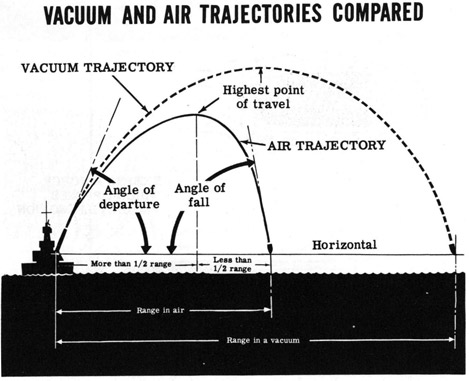"Any projectile fired in a vacuum at an elevation of 40 degrees and with an I. V. of 2500 fps will attain a horizontal range of 192,000 yards (almost 100 miles). At the same elevation in air, a 16-inch projectile will attain a range of only 42,000 yards, a 5-inch projectile 17,000 yards and a 1.1-inch projectile only 7000 yards."
