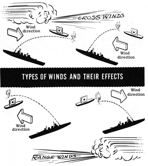 Group B errors are from wind, and motion of the target and the gun. Target motion correction was adequately covered in my posts on fire control, although it bears emphasizing that a target moving at 30 kts covers over 1,500 yds in the time it takes a 16" shell to reach maximum range. Wind is broken down into range wind, along the line of sight, and cross-wind, perpendicular to the LoS.