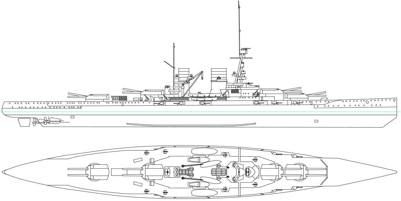 Lion was a dramatic move away from the previous lightly-armored battlecruisers and into a ship that was more of a fast battleship, although not to the extent of the German battlecruisers. The 9" belt was 50% thicker than those of the previous classes, and a 6" upper belt was fitted, something completely absent from the previous classes. One of the major drivers for this was the increase in battle ranges, which meant that armor was now potentially useful against heavy shells. The four 13.5" twin turrets were finally all on the centerline, including a superfiring turret forward.2 Speed also increased from 25 to 28 kts, to match the German Moltke.
