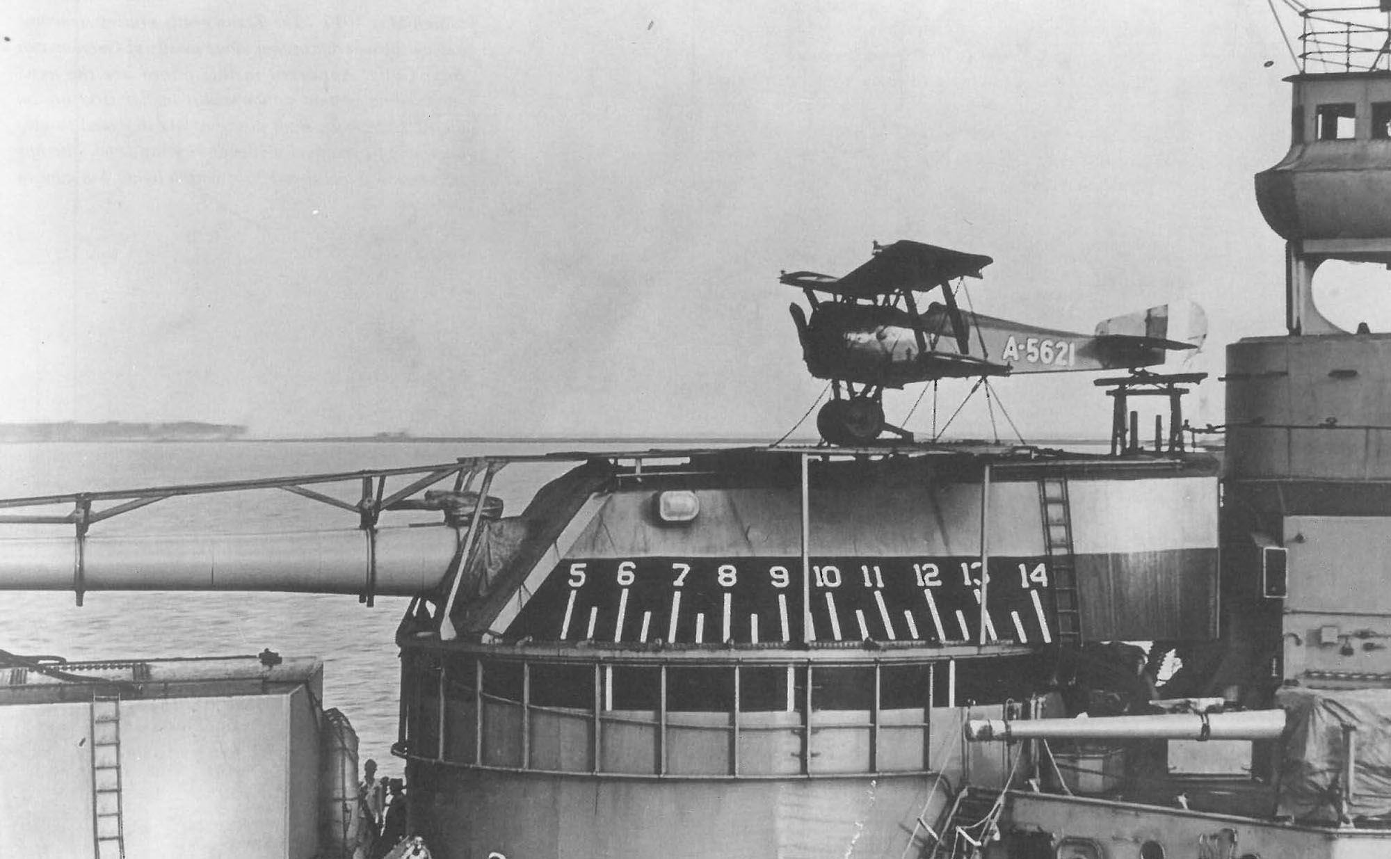 One solution was to fit the battleships to launch landplane fighters themselves. If a rotating flying-off platform was used, it could be aligned with the wind, removing the need to leave formation and then catch up again that had previously plagued flying from units of the fleet. This method could routinely achieve headwinds of 25 knots or more, and with such headwinds the fighters of the day, extremely light by modern standards, needed a run of only about 30' to get airborne. And a battleship came with several ready-made turntables big enough to support such a platform, in the form of its turrets. Of course, there was the small problem of landing the airplane. If the fleet was close enough to a shore base, the airplane would land there, but in operations, the pilot would ditch the plane near a destroyer, and be picked up by boat. If time permitted, the airplane would be hoisted aboard a ship, and the engine and weapons salvaged. This was acceptable because airplanes of the day were relatively cheap and the rapid development of aviation meant that last year's models were often semi-obsolete.1 Later on, the same technique was used to increase the fleet's supply of two-seater spotting planes, although they were heavier and required a longer takeoff run. This was solved by extending the flying-off platform from the roof of the turret onto the gun barrels. In action, the planes would be flown off, or, if that wasn't possible, pushed over the side due to the fire hazard they presented, and a small section of the platform would be removed to allow the guns to elevate normally.2