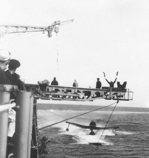 As difficult and complicated as launch was, recovery was much worse. If the ship was anchored or moving slowly on calm seas, then it was simple enough. The seaplane would alight, then taxi up to the ship, where the crane would bring him aboard. But conditions like this were rare in war, when seas were often rough and ships couldn't slow down to recover their aircraft. Even the SC Seahawk, the last and most advanced catapult plane used by the USN, could only land if the waves were 5' or less in height, which was only the case about half the time in the North Atlantic.