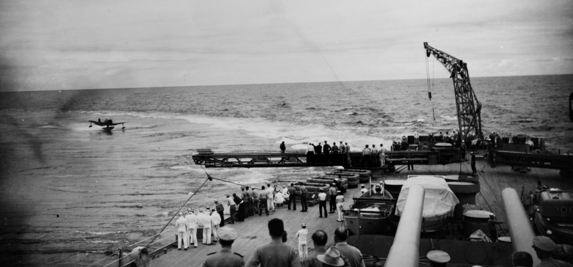 An OS2U is launched from Missouri, 1944