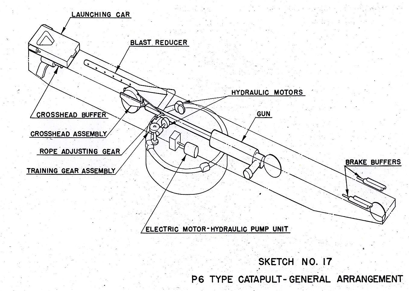A 5" blank would be loaded into the breech of the catapult mechanism, with the amount of powder carefully calibrated for the weight of the aircraft, and the catapult would be trained out at least 30° from the centerline of the ship. Usually, it would be angled to give the pilot a headwind, increasing his airspeed in the critical moments after launch, but in an emergency, the plane could be launched directly abeam regardless of wind. The pilot would be signaled to test his engine, running it up to full power to make sure there weren't any problems. When he was satisfied, he nodded to the catapult officer, who would then request permission from the bridge to launch. After that was granted, he would again request full power. Once that was reached, the pilot would hold out an arm, then draw it back to his chest. At that point, it was all in the hands of the catapult crew, and the pilot wasn't even allowed to signal an abort.