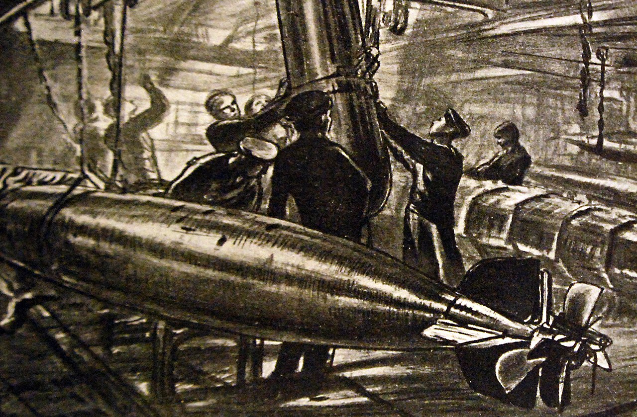 A drawing of a torpedo flat on a British dreadnought. The torpedo at left is partway into its tube, while the men are striking down another torpedo in the center.3