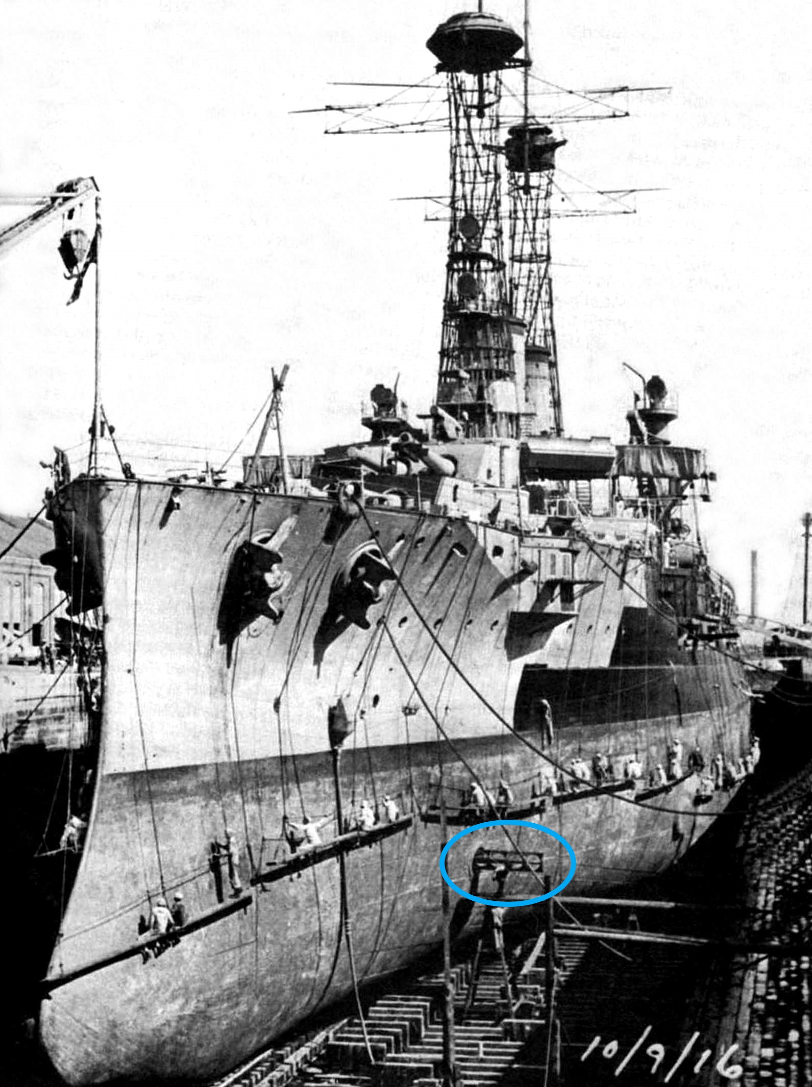 USS Florida in drydock with her torpedo bar extended, circled in blue
