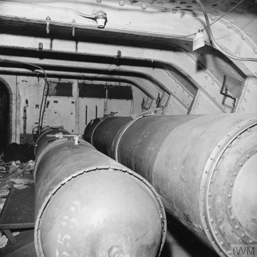 HMS Hood was originally designed with a single twin underwater torpedo room, but when redesigned in the aftermath of Jutland, she was also to be given 8 above-water torpedo tubes,3 despite the protests of Director of Naval Construction Eustace Tennyson d'Eyncourt. d'Eyncourt pointed out that they were located directly over the ship's main strength girder, and could break the ship in half if they were set off. Ultimately, only four were fitted to Hood as completed, and they were initially labeled as "peacetime only" fittings in view of the danger they posed to the ship. Initially, the plan had been to provide them with 5" armor, but the need to increase deck protection meant that they were unprotected. In 1929, the armor was finally installed and the above-water tubes approved for wartime use. The underwater torpedoes were deleted during a refit in 1937, but the above-water torpedo tubes were retained. Hood’s destruction immediately raised suspicions that the torpedoes had been responsible, but they were ultimately ruled out by the investigation, a finding confirmed by later analysis and inspection of the wreck.