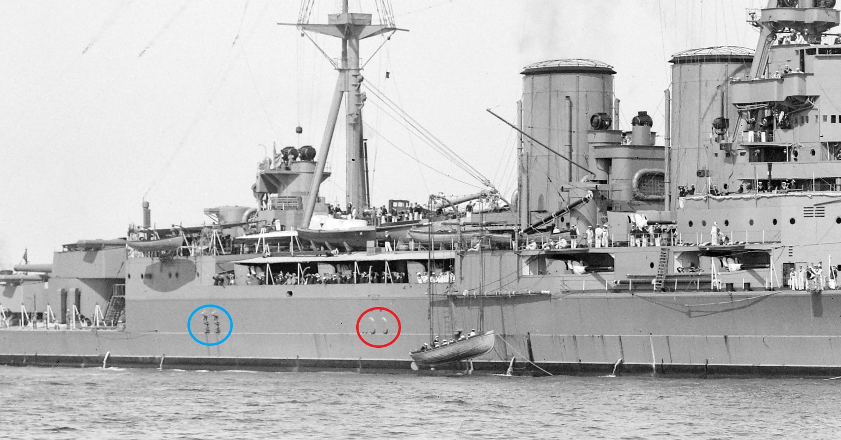 HMS Hood. The installed tubes can be seen aft, circled in blue, while the blanking covers for the other pair are circled in red.