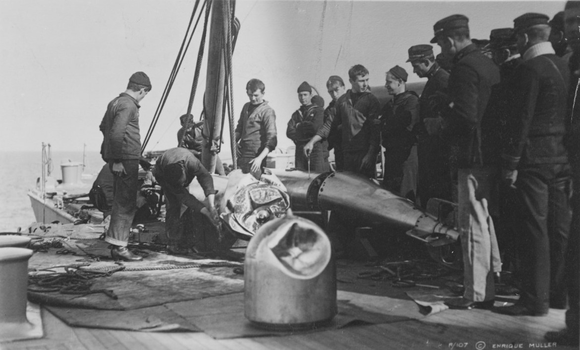 A torpedo on the deck of the American battleship Florida. The object in the foreground is probably a practice warhead, dented by running up against some obstacle.