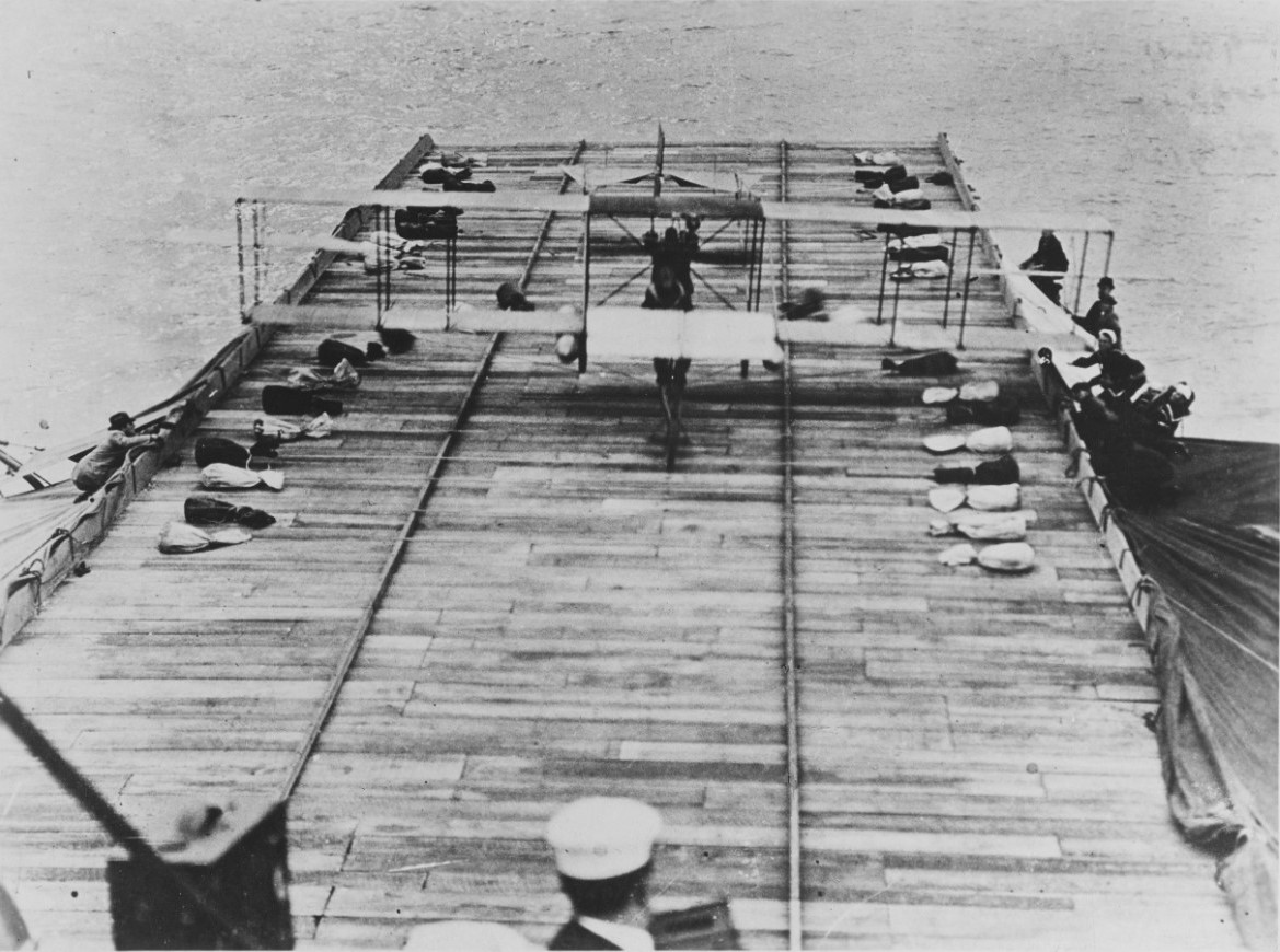 Now, in the very early days of aviation, stall speeds were incredibly low, so the amount of deck required was equally low. The first plane to take off from a ship, Eugene Ely's Curtiss Model D, had a flying speed of only 30 kts, and Ely took off from the stationary Birmingham into a 10 kt wind. But he had only 50 hp and a 53' run down the sloped deck, so this wasn't quite enough and his propellers brushed the water before he got to flying speed. But if he had been willing to wait for Birmingham to get up to speed, as had been the original plan, it would have been no trouble at all, as indeed was the case for Cmdr Charles Sampson of the Royal Navy, who made the first takeoff from a moving ship, flying from HMS Hibernia two years later.