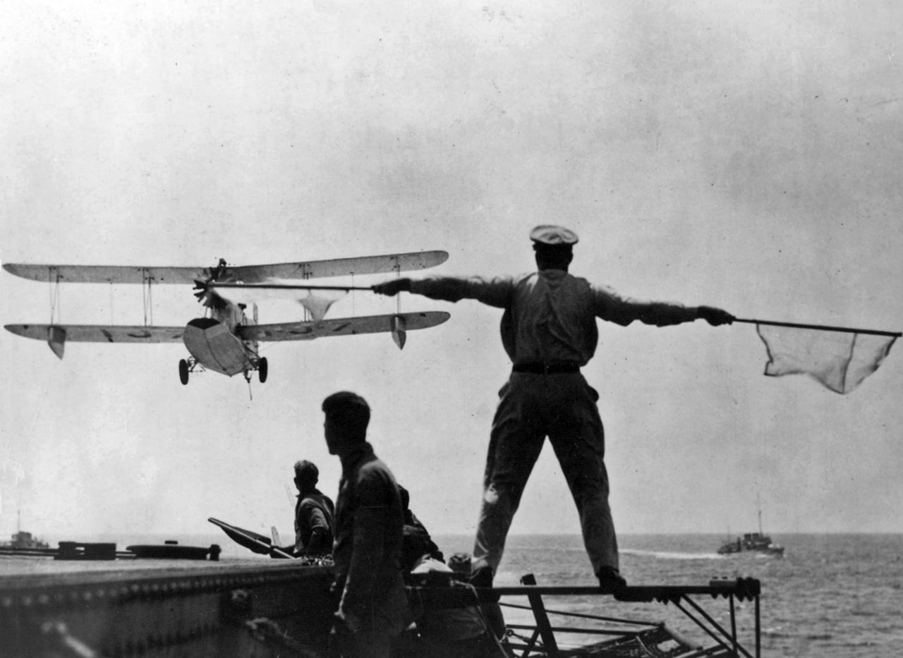 During WWI, the Royal Navy had worked out the basic mechanics of operating airplanes from ships, but the absorption of its aviation units into the Royal Air Force in 1918 saw British naval aviation stagnate in the years after the war. Progress would instead come from the United States, which commissioned its first carrier, Langley, in 1922. Langley had been built as collier Jupiter, and was converted as simply as possible, with a deck built over the existing ship and the coal holds converted to carry aviation supplies, except the one that had machinery for the single lift. There was no hangar as such, with planes being stored under the open-sided flight deck on what had been the upper deck of Jupiter. Moving them about was the work of a pair of overhead cranes, which meant that early operations, where each plane had to be struck down before the next could land, were even slower than aboard Argus.