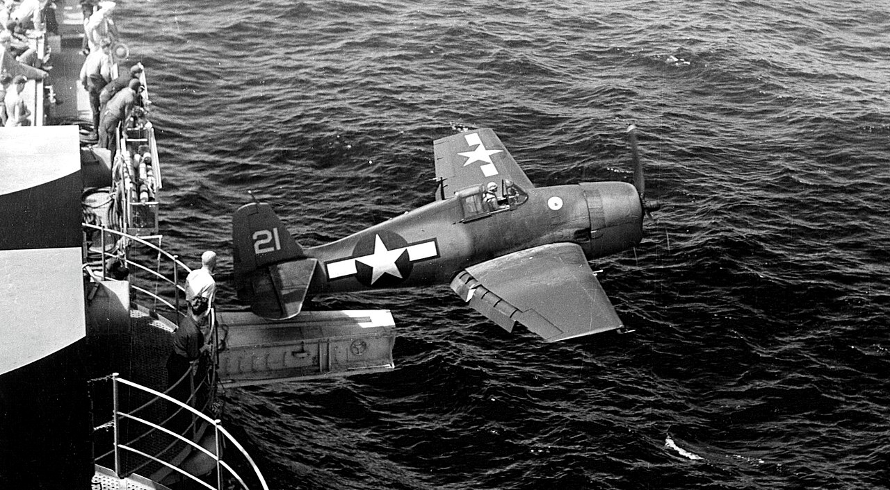 An F6F Hellcat is catapulted from the hangar on Hornet (CV-12)