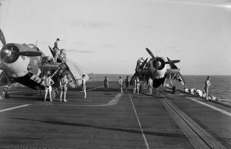 An Avenger sits on the catapult aboard escort carrier HMS Shah