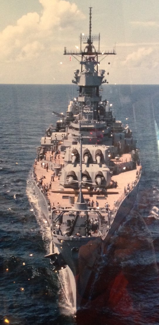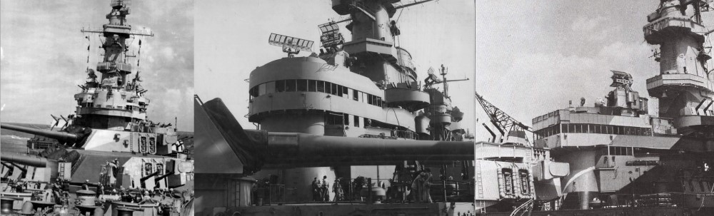 When reactivated for Vietnam, New Jersey received a distinctive structure high in the tower for ECM systems. This structure was reused in the 80s, while the other three ships all had very similar air-defense levels. The other differences are minor. There were often small differences in the antenna layout, and some of the fittings differed. I once was sent bow-on picture of one of the ships in the 80s, from an angle where no markings were visible. New Jersey was easily eliminated, due to the differences at the air defense level. I then took a careful look at the ventilators on the forecastle, and was able to eliminate Iowa because they added more in the later ships. I was then stumped for a while, but eventually realized4 that the very tip of the bow differed slightly due to the way they'd removed the Oerlikons, and nailed it down as Wisconsin. On a slightly less geeky level, when watching the movie Battleship5 I noticed that the ladders to the 05 level on Missouri were backwards relative to those on Iowa.