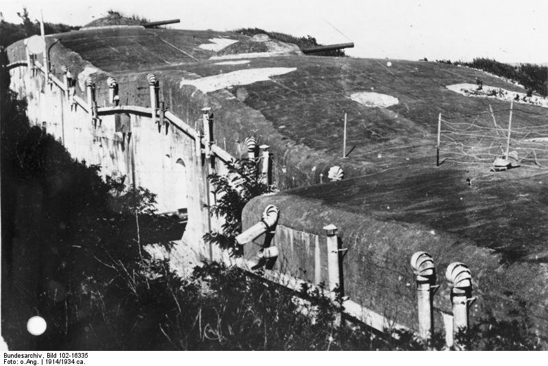 These works were never challenged during the war that broke out in 1914, a condition that applied even to the vast majority of fixed fortifications in the combat zone. Submarines, mines, and torpedo craft had made coastal areas very lethal for enemy ships, and the primary purpose of coastal fortifications in practice was to stand off an attacking force while it was attrited. Oddly, the British, despite frequent panics over German invasion, didn't invest heavily in fortifications. For reasons that aren't entirely clear, they focused instead on defeating a landing on an undefended section of coast, and the Royal Navy managed to win the battle with the Army over its ability to prevent invasion.3 A few new positions were set up to protect the bases from which a war with Germany might be fought, although others had to be improvised after war broke out. The Germans invested more heavily in fixed defenses. The fortifications around their colony at Tsingtao in China were sufficient to force the Japanese to land their troops in Chinese territory and attack from the landward side, much as they had done at Port Arthur a decade earlier. Stronger defenses were in place on the North Sea and Baltic coasts, and were sufficient to deter several British schemes that involved amphibious landings in the area.