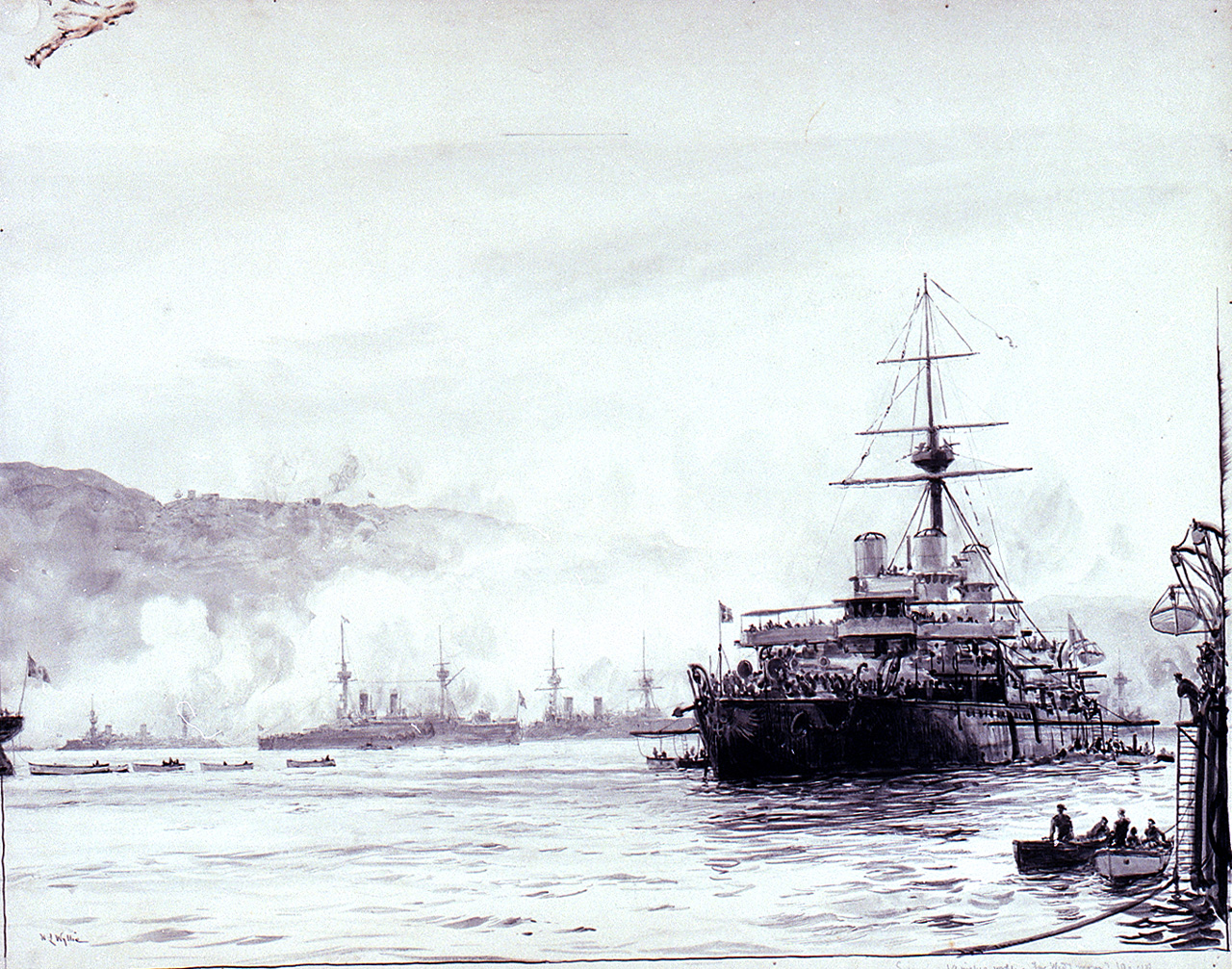Tensions with the Ottomans had begun to rise after Goeben and Breslau took refuge in Constantinople during the opening days of the war, but the Turks remained neutral until the ex-German ships, now sold to them, conducted a rogue bombardment of Russian positions in the Black Sea. The British and French retaliated on November 3rd by bombarding fortification in the Dardanelles, the westernmost of the Turkish straits, blowing up a magazine on one of the outermost forts. This performance made them overconfident in their ability to take out fortifications with naval bombardment, and after war was declared two days later, planning began in earnest for an all-naval campaign against the Dardanelles.