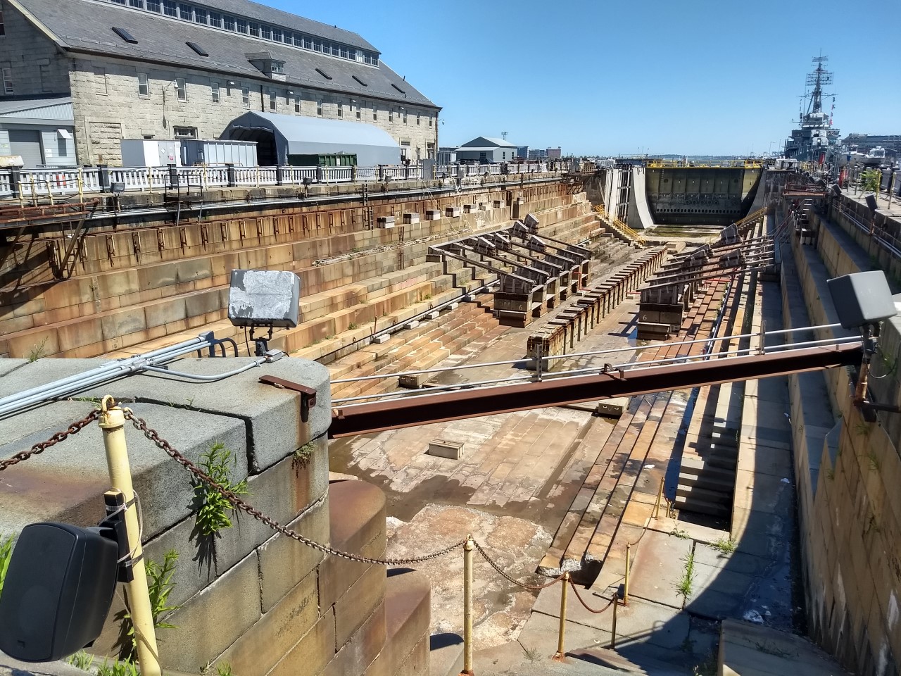 By the dawn of the 19th century, the drydock was a standard tool of naval power, and the US, recently independent, decided to get in on the action, although its first effort in the field of ship maintenance was not a drydock but a marine railway built in 1822 at the Washington Navy Yard. Instead of draining water from around a ship, the marine railway places a cradle under the ship and hauls it up an inclined track for work on the hull. A few years later, Congress authorized drydock construction, with drydocks in Norfolk and Boston being completed in 1836. Both still exist, with the Norfolk dockyard remaining part of Norfolk Navy Yard, and the Boston dock accessible to the public as part of Charleston Navy Yard, home to Constitution and Cassin Young. The Norfolk dock was enabled by a new technology, the steam engine, which allowed the dock to easily be pumped out despite the small tides. Both docks were 40' deep, 340' long and 100' wide, enough to take even a contemporary ship of the line. The original wooden caisson at Boston lasted until 1901, when it was replaced by the first steel structure built by the yard. A replacement for that one was built in 2015, before the dock was used for maintenance on Constitution.