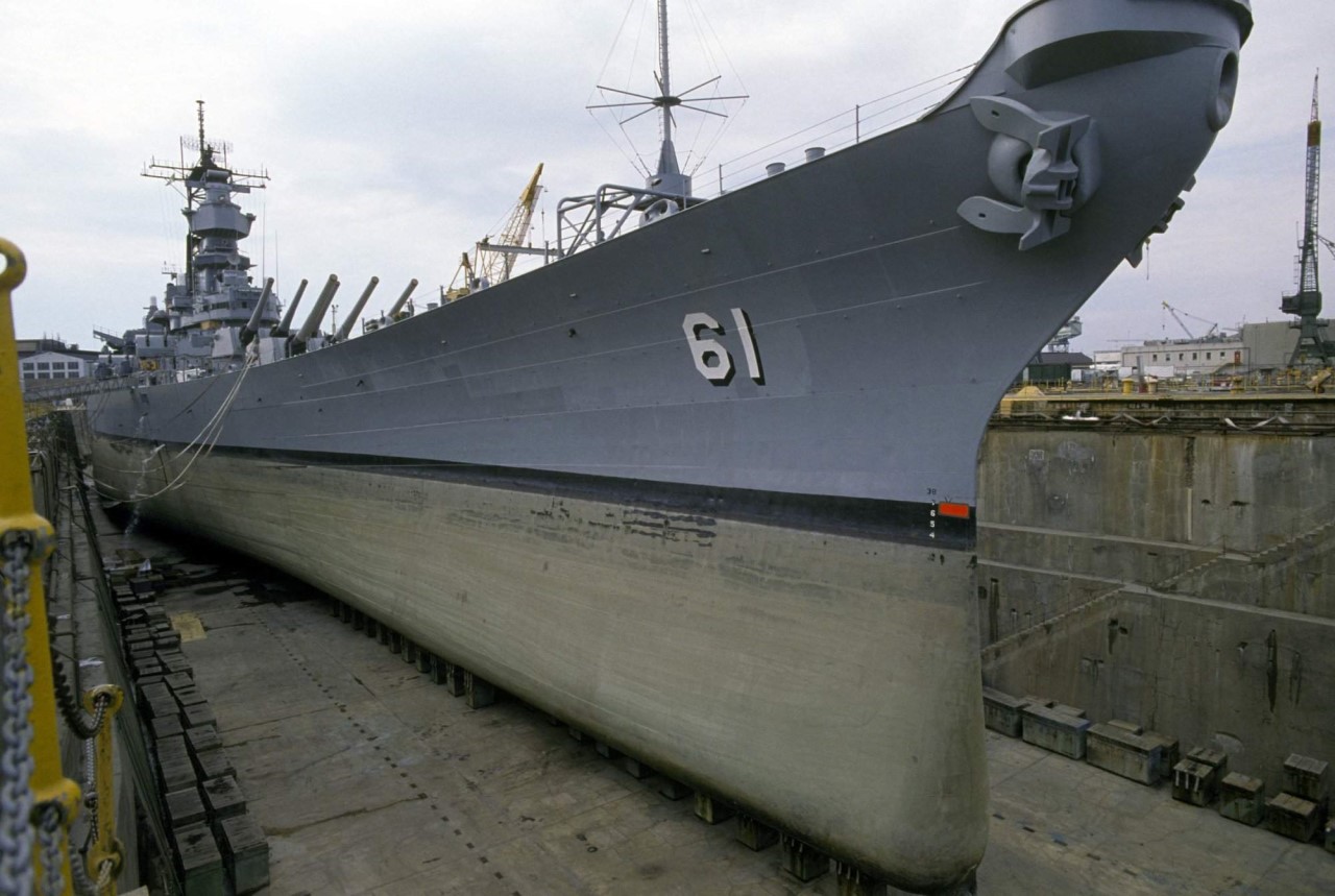 Various considerations attend this work. Some navies prohibit the carriage of ammunition into drydock, while others simply insist that the magazine flooding mechanism be connected to the shoreside firefighting system. The blocks insulate the ship from ground, so lightning straps also have to be fitted. Undocking is pretty straightforward compared to docking. The bottom is checked to make sure that everything is watertight, and the shores fore and aft are removed to avoid the risk of damage to the hull if the bow or stern floats first. Then the dock is flooded, and the caisson, if any, removed, and the ship floated out. That said, problems can arise if significant weight has been added or removed and the ship trims differently than she did when she entered dock. As a result, it is standard practice to keep track of alterations and ballast as necessary to ensure a safe float-out.