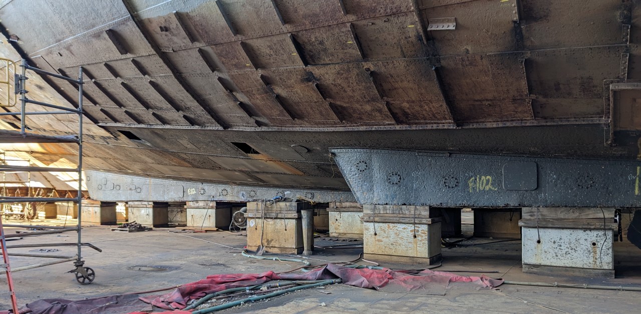 Keel blocks hold up Texas during her 2022-2023 drydocking