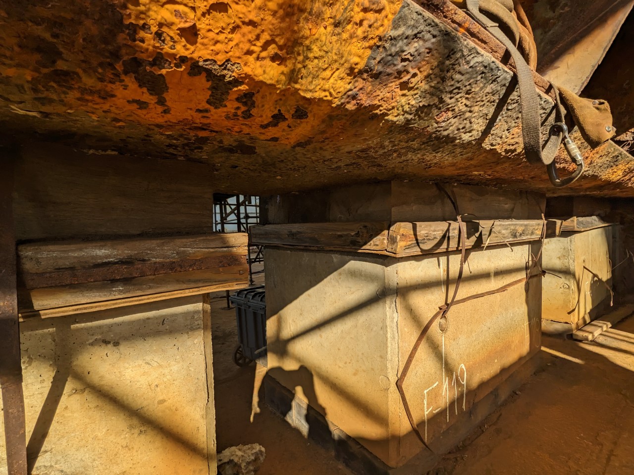 Docking keels on Texas. Note that these keels are stuffed with teak, which is exposed on the bottom. It's in remarkably good shape for 110-year-old wood.