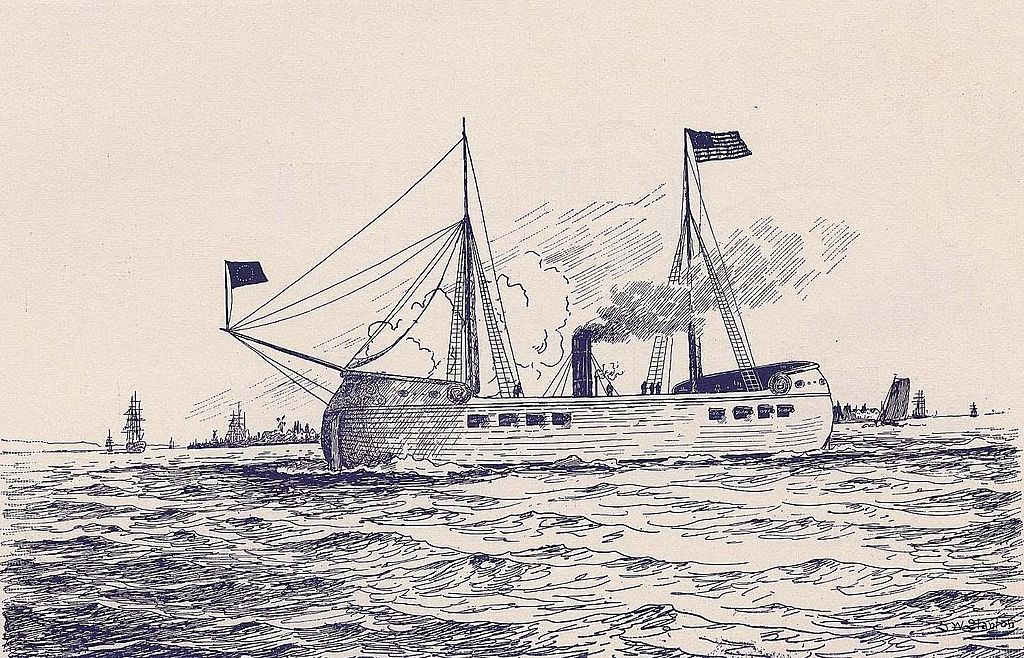But Fulton wasn't done with attacking ships, and he quickly came up with another idea, a harpoon gun with a timed explosive charge attached to it by a 60' line. After the harpoon was embedded in the side of the ship, the charge would be drawn alongside by the ship's motion, when it would then detonate. This was never tested properly, and Fulton soon moved on to an underwater gun powered by compressed air, which in theory would be able to attack the underside of a target. This was apparently enough to get all the crazy out, and he moved on to working on the spar torpedo around 1813, possibly driven by the fact that there was an actual war on and he wanted useful weapons. Fulton helped with a number of underwater attack schemes during the War of 1812, although his attention was more focused on a scheme for a steam-powered battery to defend New York, which he eventually built in the form of Demologos, the world's first steam-powered warship. Unfortunately, the war ended before it could see action, and it was renamed Fulton after its inventor who died weeks after the end of the war. On the underwater warfare front, Fulton had inspired numerous imitators who attempted to attack the British, primarily with drifting mines and Turtle-type submarines, but none did any damage.