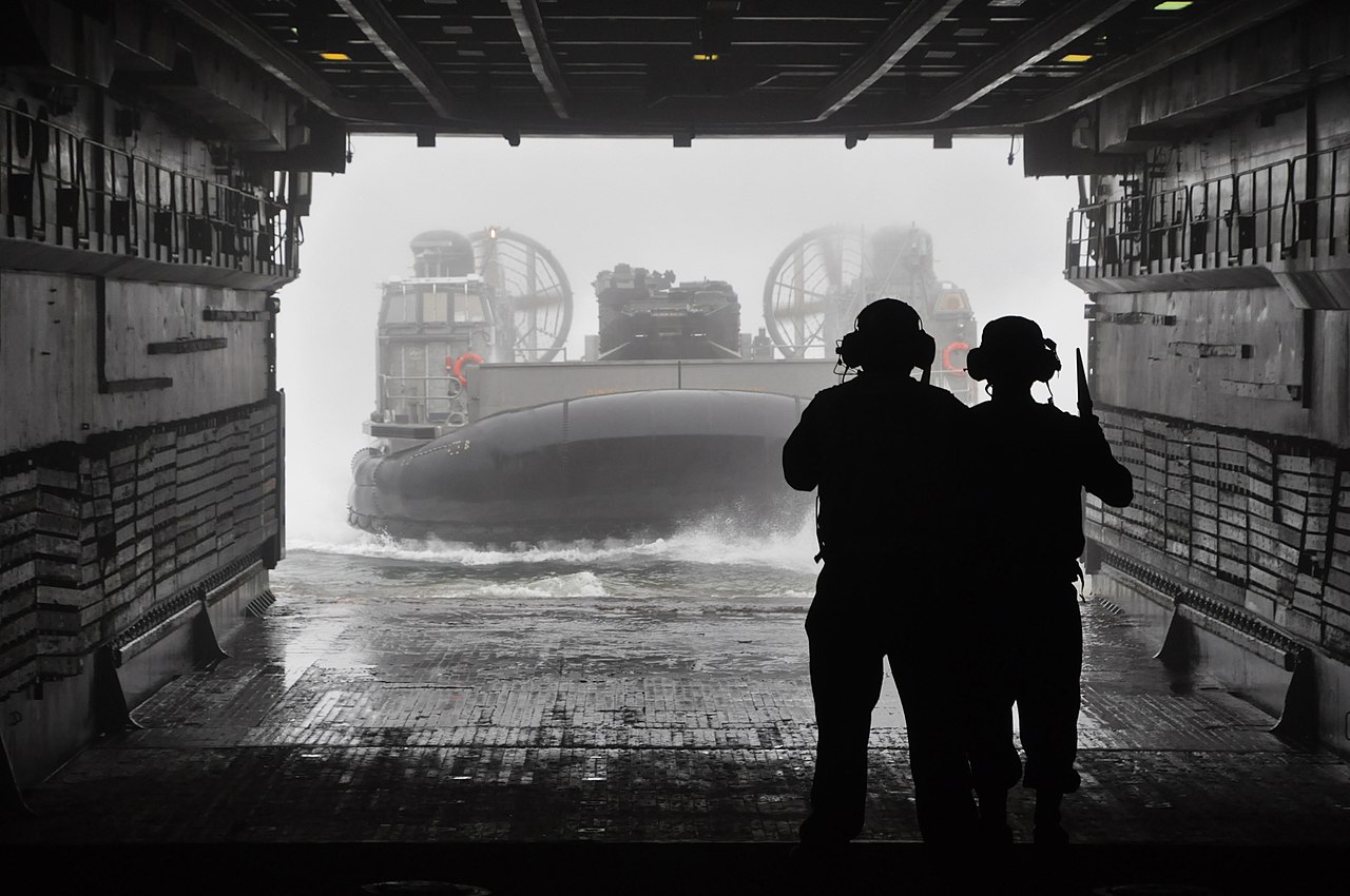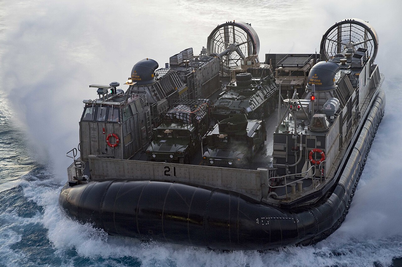 The Soviets were the first to introduce a hovercraft in this role with the Gus class in 1969, and their interest has continued with the Lebed, Aist and Zubr classes, the last being the world's largest hovercraft at 550 tons fully loaded. The USN took slightly longer to build the imaginatively-named Landing Craft, Air Cushion (LCAC), which entered service in 1986. Capable of carrying up to around 70 tons at 40 kts, or hitting 70 kts while empty, the Marines have considered it the greatest advance in amphibious warfare since the helicopter, despite the teething problems that it brought. Existing well decks were designed to carry long, thin craft like the LCU, and in at least some cases, they had very little ability to carry LCACs. On the other hand, the LCAC could be deployed and recovered without having to flood down the well deck, which saved quite a bit of time and hassle. And because it is built to aircraft standards, it's quite vulnerable to damage, although it is generally hoped that its mobility means it can find an undefended beach to cross.5