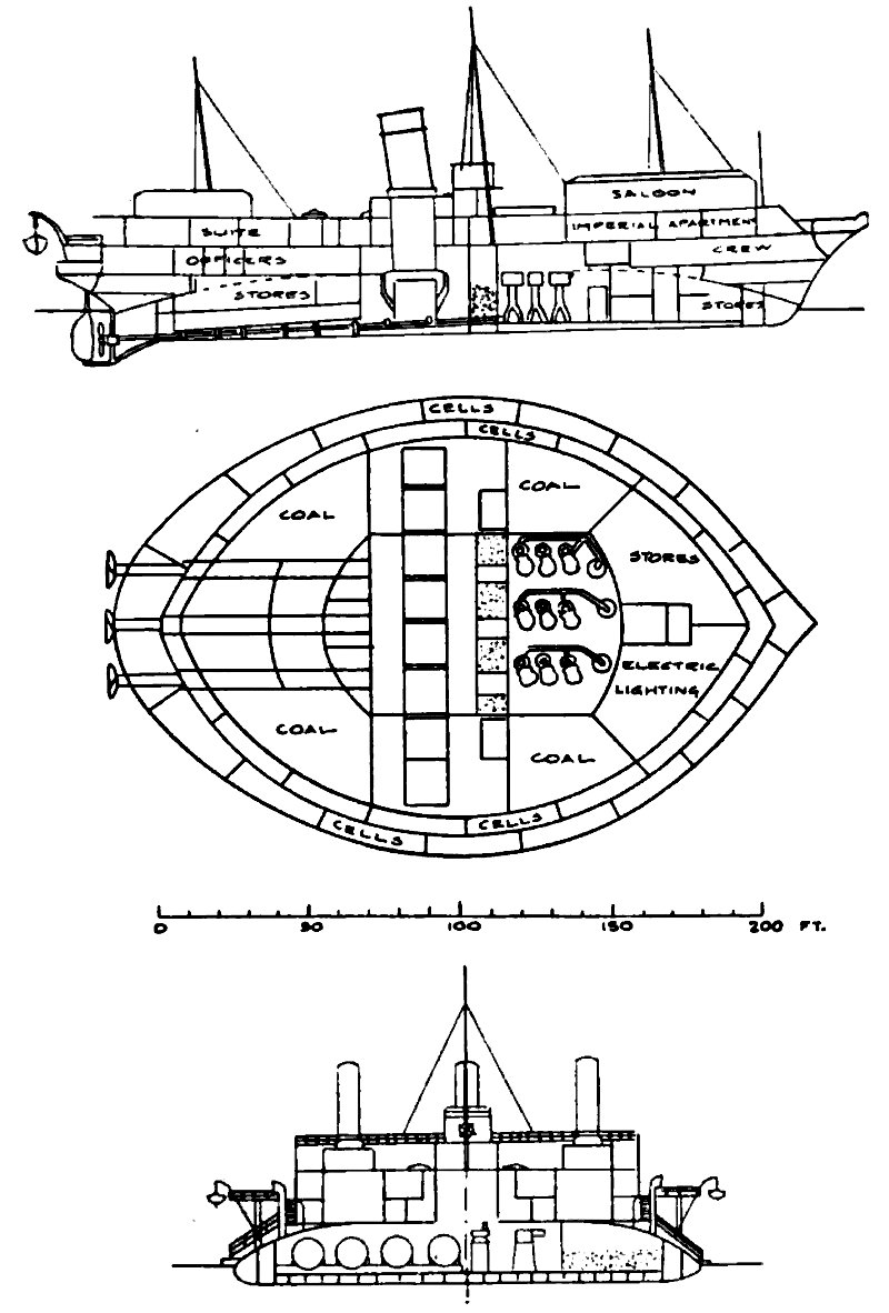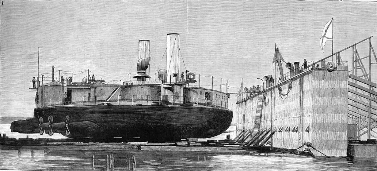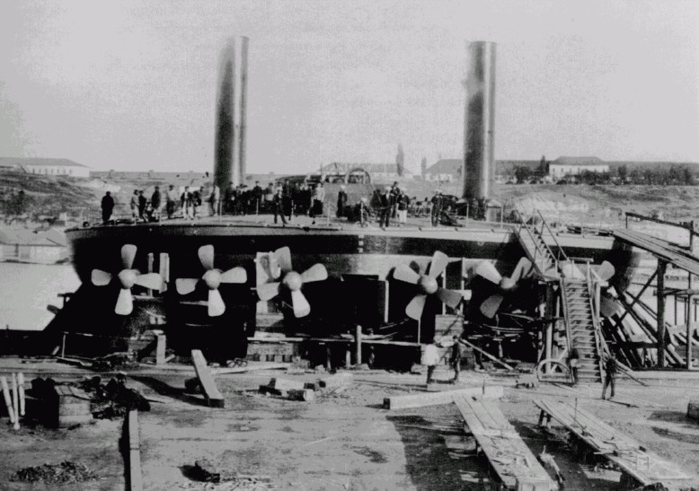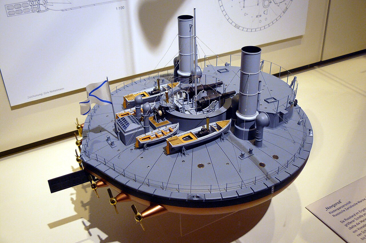 The story of these ships has its origins in the 1860s, when Russia was forbidden by the treaty that ended the Crimean War from operating more than half a dozen 800-ton1 coastal defense ships in the Black Sea. This was pretty small, particularly with the advent of ironclads, and thought soon turned to how to get the most out of this tonnage. It was clearly not enough for any conventional ironclad that could be competitive with vessels laid down by possible enemies like Turkey and Austria, so one Russian officer, Andrei Popov, proposed something radical. He had noticed that ironclads were generally growing shorter relative to their beam, as this made it more efficient to carry armor on a given displacement. Taken to its logical conclusion, a circular vessel would make most efficient use of armor, and while this would probably not be great for seakeeping or speed, a few small test boats worked well enough and it would also minimize draft, a serious concern for vessels designed to work in the shallow waters of the Crimean coast.