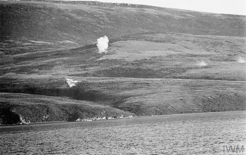 In early April 1982, Argentina invaded the Falkland Islands, a few desolate rocks in the South Atlantic. The British mobilized their fleet in response. The carriers arrived off the Falklands on May 1st, swiftly defeating the Argentine Air Force. The Argentine Navy tried to interfere the next day, but withdrew after the cruiser General Belgrano was sunk by a submarine. Two days later, the Argentinians struck back, sinking the frigate Sheffield with an Exocet missile. Two weeks later, on May 21st, British troops landed at San Carlos Water on the west coast of East Falkland. The Argentine Air Force quickly got wind of this, and launched numerous sorties against the invasion fleet. The first three days were brutal for both sides, with the British losing two frigates and suffering several others damaged, while a third of the Argentine jets were shot down.1