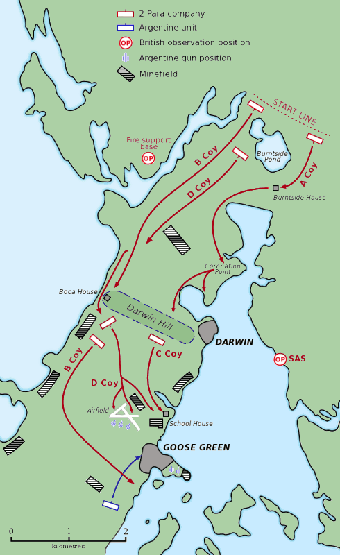 Outside of Stanley itself, the only major Argentinian concentration on East Falkland was around Darwin and Goose Green, 12 miles south of the beachhead. The force there had only limited offensive capability, so the initial plan had been to bypass it. However, it would be at least a week before enough forces were in position to begin the attack on Stanley, and the British felt the need for a victory before then, so 2 Para moved out at dusk on the 26th, with the attack scheduled for the next evening. They made it into position undetected, but the BBC soon announced that the British were about to attack Goose Green, sparking predictable fury among the men in the Falklands.