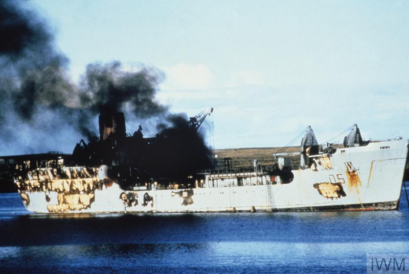 The Skyhawk's navigation was significantly better, but they nearly missed their target as well, the LSL's Sir Tristram and Sir Galahad being deeper in the coves than expected and not visible from low offshore. As they turned for home, one of the jets got high enough to see their masts, and the Skyhawks turned to attack, the leader splitting his efforts between the two LSLs. The unloading of the vessels, particularly Sir Galahad, had been delayed by a lack of landing craft, and the Welsh Guards were still aboard at 1315, when the Skyhawks suddenly appeared, too close for the British to do anything but take cover. Three bombs struck Sir Galahad, while Sir Tristram was hit twice, although she was lucky and the bombs didn't go off. A third one, landing close to her stern, did, and the blast tore off her stern ramp. Both ships immediately caught fire, and Sir Galahad was ordered abandoned. Casualties were heavy, particularly among the Guardsmen onboard, but five helicopters were on hand, and they, working with the various small craft in the area, were able to evacuate all healthy survivors within 35 minutes. It took another half-hour to remove the badly wounded from the wrecked and burning ship.