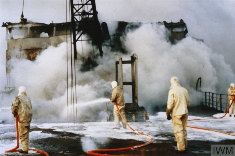 A Damage Control crew on Sir Galahad battles the flames