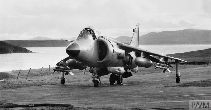 A Sea Harrier at the forward strip at San Carlos