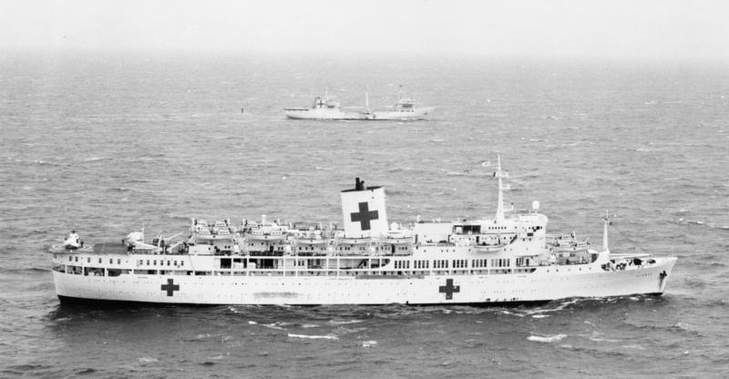 The bad weather persisted on the 4th, keeping the Harriers grounded and slowing helicopter operations. Unloading and reloading continued at Ajax Bay, with Sir Percivale preparing to take another load to Teal Inlet while Sir Tristram took on supplies for Fitzroy. A captured coastal freighter was used to carry two companies of the Gurkhas forward to Bluff Cove, near Fitzroy. Argonaut, damaged on May 21st, was finally repaired enough to make her way home. She departed at noon after transferring all of her excess supplies to other ships. In the "Red Cross Box", Argentine hospital ship Bahia Paraiso arrived to take Argentine wounded from Uganda, and announced her intention to retrieve more wounded from Port Howard and Fox Bay on West Falkland. This caused a scheduled bombardment by Plymouth to be cancelled.