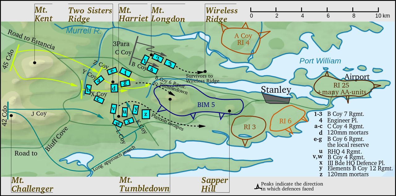 The first attack would be carried out by 3 Para, 45 Commando and 42 Commando, who would seize the Argentinian positions on Mount Longdon, Two Sisters and Mount Harriet respectively. All three were major hills overlooking Stanley, and each was held by about a battalion, so the attackers had maybe a 50% edge in numbers at each one. Mount Longdon, the northernmost of the hills, was also the most difficult to take. Despite the support of a battery of 105mm guns, and Avenger, 3 Para's initial attack was pushed back. They tried again and drove the defenders out, but at a cost of 23 dead. Two Sisters, a twin-peaked hill southwest of Longdon, was nearly as brutal. The Marines of 45 Commando were two hours late setting off, and quickly ran into heavy resistance. They eventually pushed their way onto the hill thanks to sheer tenacity and heavy fire support, including the twin 4.5" guns of Glamorgan, as well as liberal use of Milan anti-tank missiles to eliminate Argentinian positions. The Marine suffered only 8 dead, and took over 50 prisoners. The last position, Mount Harriet, fell more readily, as 42 Commando swung to the southeast, getting within 100 yards of the enemy positions before they were detected. Over 3,000 round of artillery were fired at Mount Harriet, which is probably part of the reason the Marines suffered only a single man dead in the process of taking the hill and 300 prisoners.2