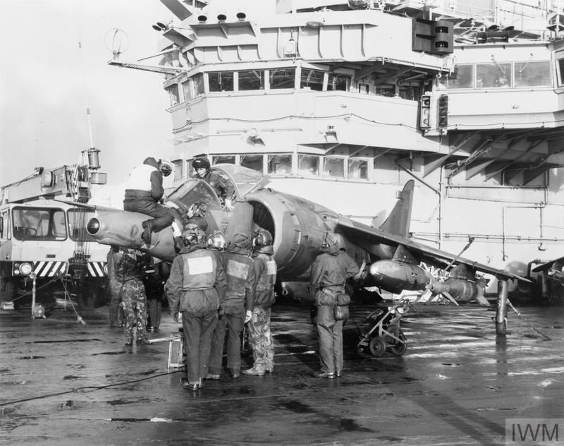 A Harrier GR3 loaded with Paveways aboard Hermes