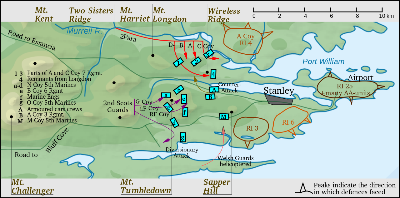 In early April 1982, Argentina invaded the Falkland Islands, a few desolate rocks in the South Atlantic. The British mobilized their fleet in response. After a fierce battle in the air and at sea, the British gained the upper hand, and began landing troops on May 21st at San Carlos Water on the west coast of East Falkland. The Argentinians attempted to defeat the invasion with air attacks, but the British eventually gained the upper hand. On the 28th, the British began the ground campaign, defeating the Argentinian garrison at Goose Green and opening the way to lay siege to the main enemy positions near Stanley. The first days of June saw the islands shrouded in clouds, but that didn't prevent the British from leapfrogging forward to Fitzroy and Bluff Cove, just to the south of Stanley. There, tragedy struck on June 8th, when an air attack caught several ships unloading. This didn't stop the British from launching their assault on the hills surrounding Stanley on the night of the 11th, securing three major hills. The final assault was scheduled for the 13th.1