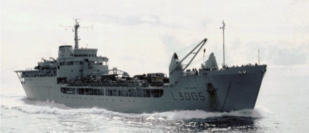 On April 9th, RFA Fort Austin became the first vessel to pass Ascension, heading south to meet up with Endurance. She took onboard a trio of Lynx helicopters, armed with the Sea Skua anti-ship missile. The Sea Skua had not yet been fully cleared for service, but these helicopters provided vital protection to the unarmed supply ship as it entered the combat zone. Three days after departing Ascension, Fort Austin rendezvoused with Endurance, then down to two day's worth of food, and transferred over 200 loads by cable and helicopter. The next day, during a series of transfers running from morning until midnight, another 300 loads went to Antrim, Plymouth and Tidespring, headed south to liberate South Georgia. The afternoon of the 14th, less than a day later, saw a third series of transfers begin, 380 loads to the main surface task force of Sheffield, Brilliant, Glasgow, Coventry and Arrow. The RFA took aboard 200 loads to backhaul to Ascension during this process, everything from training ammunition to excess paint,3 and possibly including several nuclear depth charges carried aboard the ships. She dropped this backhaul off and took on another 480 loads within 48 hours before heading south again, one of many tankers and supply ships that kept the force operating.