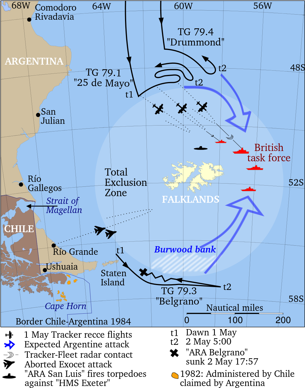 6 It should be noted that the British had previously told the Argentinian government via diplomatic note that any vessel or aircraft that posed a threat to the British fleet, regardless of location relative to the exclusion zone, would be attacked, giving flat lie to many of the claims about Thatcher's decision. ⇑