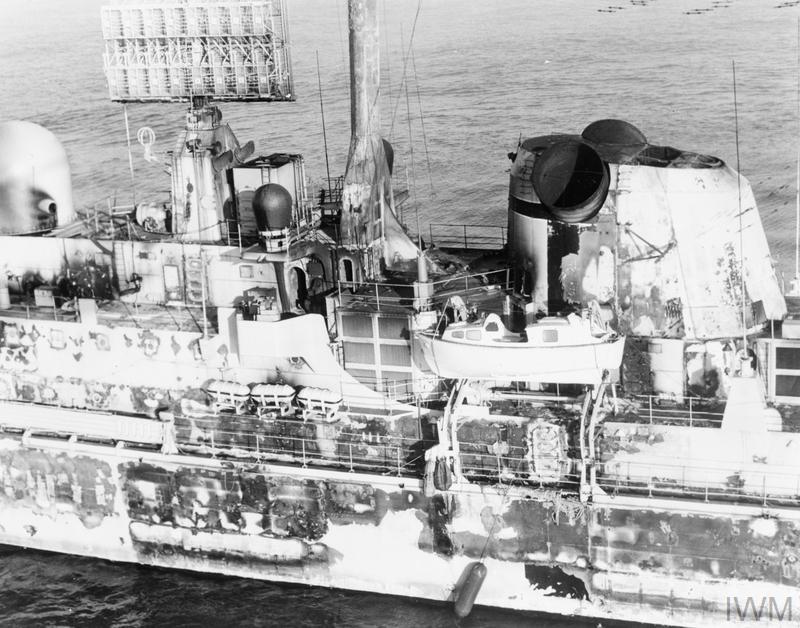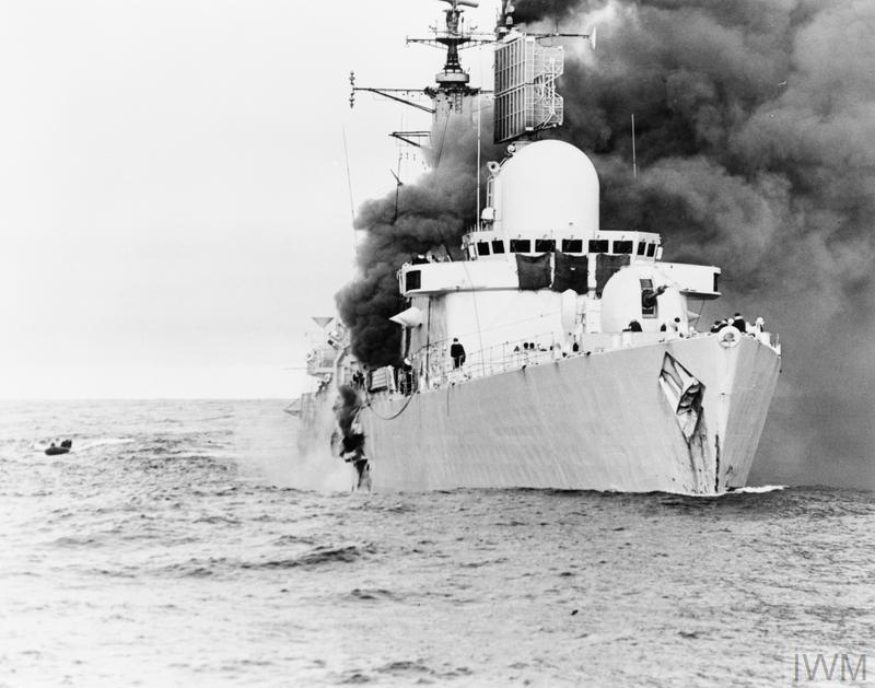 Sheffield remained afloat for the next six days, in the hope that she would absorb Argentinian air or submarine attacks that otherwise might damage a valuable ship. Several surveys were made during that time, to evaluate the possibility of saving the hull, and to gain information about the effects of weapon attack on a real ship. Orders were issued to tow Sheffield to South Georgia, but when Yarmouth attempted to do so on May 10th, water began to enter through the gash in the hull, eventually sending her to the bottom.