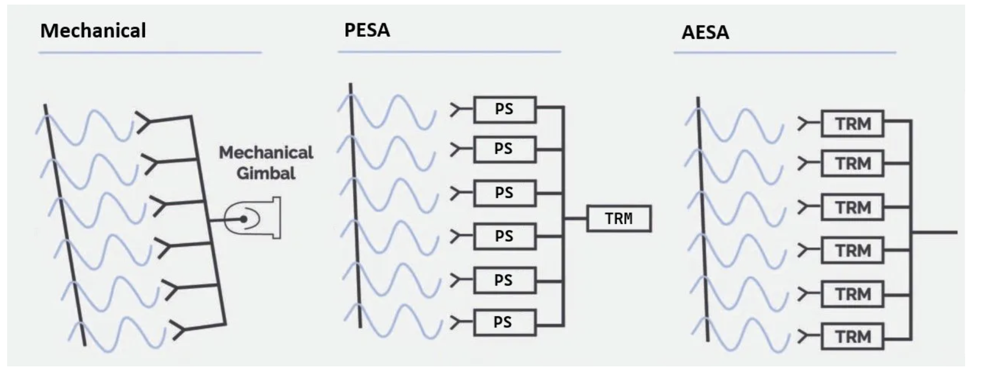 PESAs found homes on ships and ground installations, but rarely on aircraft, for two reasons. First, PESAs required serious computing power to operate, power that simply couldn't be packaged small enough for a fighter in the 1970s. Second, the more power pushed through a transmitter, the more problems there are with cooling and reliability, and these were more easily managed on land and at sea than in the air. As a result, Gen4 fighters were initially designed with mechanical radars backed by digital computers, which could approximate track-while-scan capability by recording plots and predicting future movements, but were limited by the slow mechanical sweep of the antenna and could lose tracks during rapid maneuvers. By the time computing had miniaturized enough for electronically scanned arrays to be viable on aircraft, a new architecture had emerged: the Active Electronically Scanned Array (AESA). Instead of one powerful transmitter driving the whole array, the AESA has dozens or hundreds of transmit/receive modules (TRMs), each one effectively a small radar of its own. Smaller modules cool more easily, allowing more power to be pushed through the system. The aggregate output of smaller modules can far exceed that of any single transmitter system, and having multiple independent units is intrinsically more reliable.