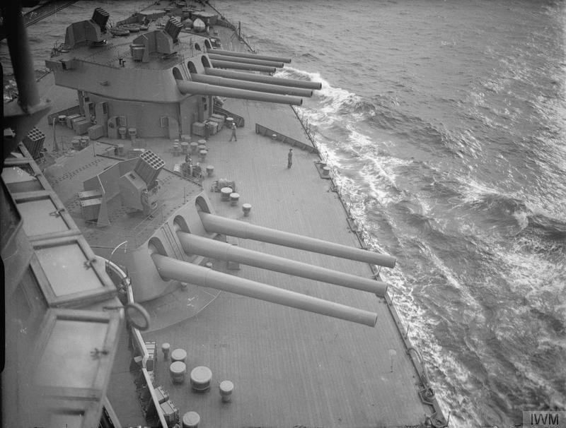 The armament was a major departure from previous British practice. The 16"/45 guns were designed to fire a rather light projectile very fast, on the basis of inadequate trials that indicated that this would provide superior penetration on oblique impacts. In practice, this simply was not true, and the resulting weapons were only very slightly superior in armor penetration to the 15"/42 of previous classes, while suffering greatly in accuracy and barrel life. A reduction of muzzle velocity mitigated these problems, but budget limits prevented the adoption of the heavier shells that would have been necessary to make the guns really satisfactory. The triple mounts were also a first for British battleships, and extensive safety measures were fitted as a result of the disaster at Jutland. These factors, combined with the drive for weight reductions, resulted in weapons that were initially unsatisfactory, although most of the bugs had been worked out by the start of WWII. Even then, it was slow to load, usually only able to fire about 1 round/gun/minute.12 The blast from these guns was ferocious, and they would do significant damage to the ship if fired abaft the beam. This was probably exacerbated by the light construction of the ships.