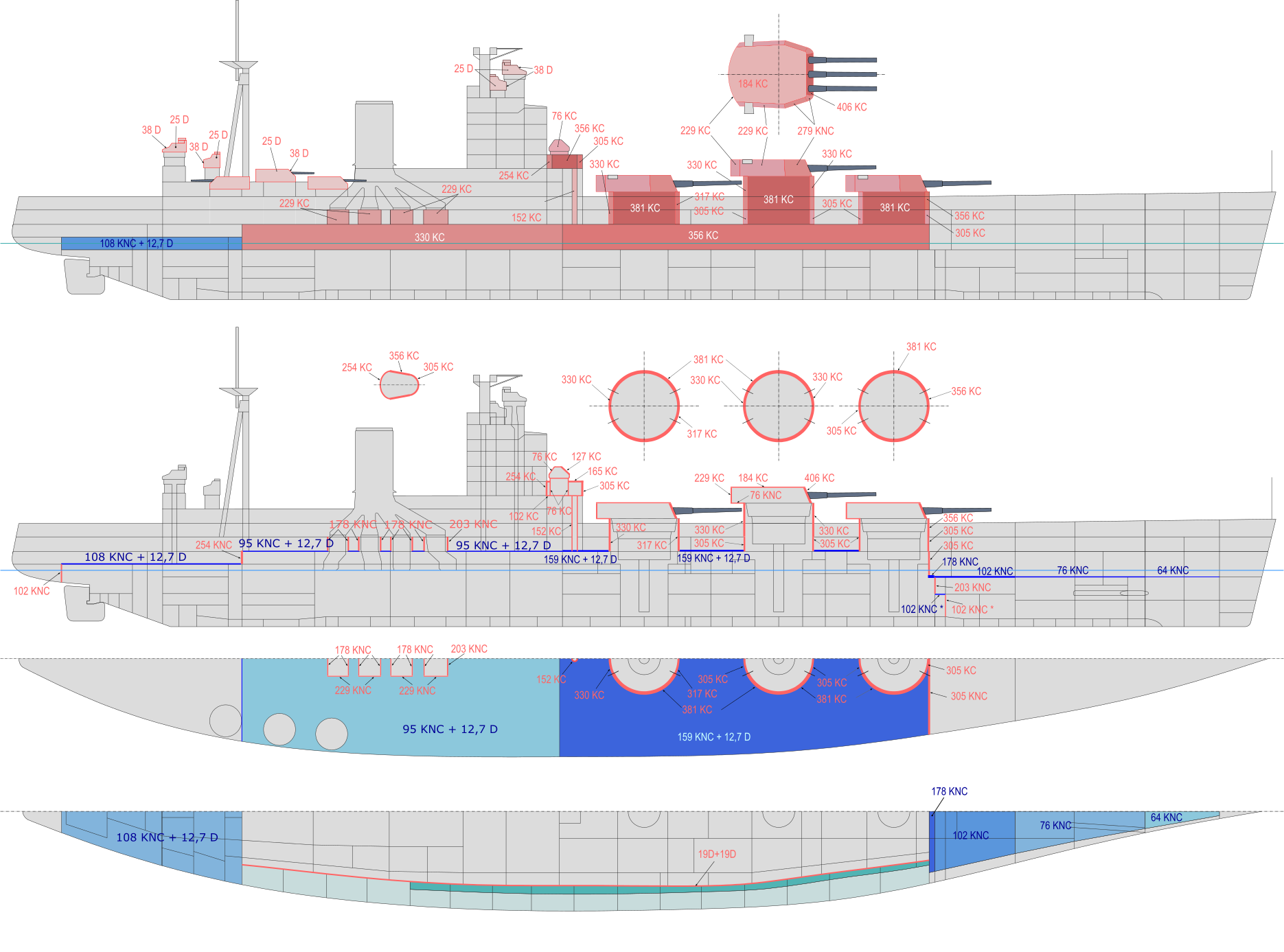 Other departures from normal practice were made to save weight. The hull was made deeper,8 which in turn reduced stresses and allowed the structure to be lighter.9 This also increased the volume available for the crew, improving habitability. Higher-strength steel and new structural practices were introduced to save even more weight, and great care was taken over details of the design that had previously been neglected. Many interior fittings were aluminum,10 and the deck was covered with Douglas fir instead of the traditional teak to save weight. The armor scheme was very similar to the G3, with a 14" internal belt over the magazines and 13" over the machinery, both inclined 18° from vertical. The deck was 6.75" over the magazine and 4.75" aft. Underwater protection was provided by a water-filled space inboard of a void, which was designed to protect against a 750 lb charge.11