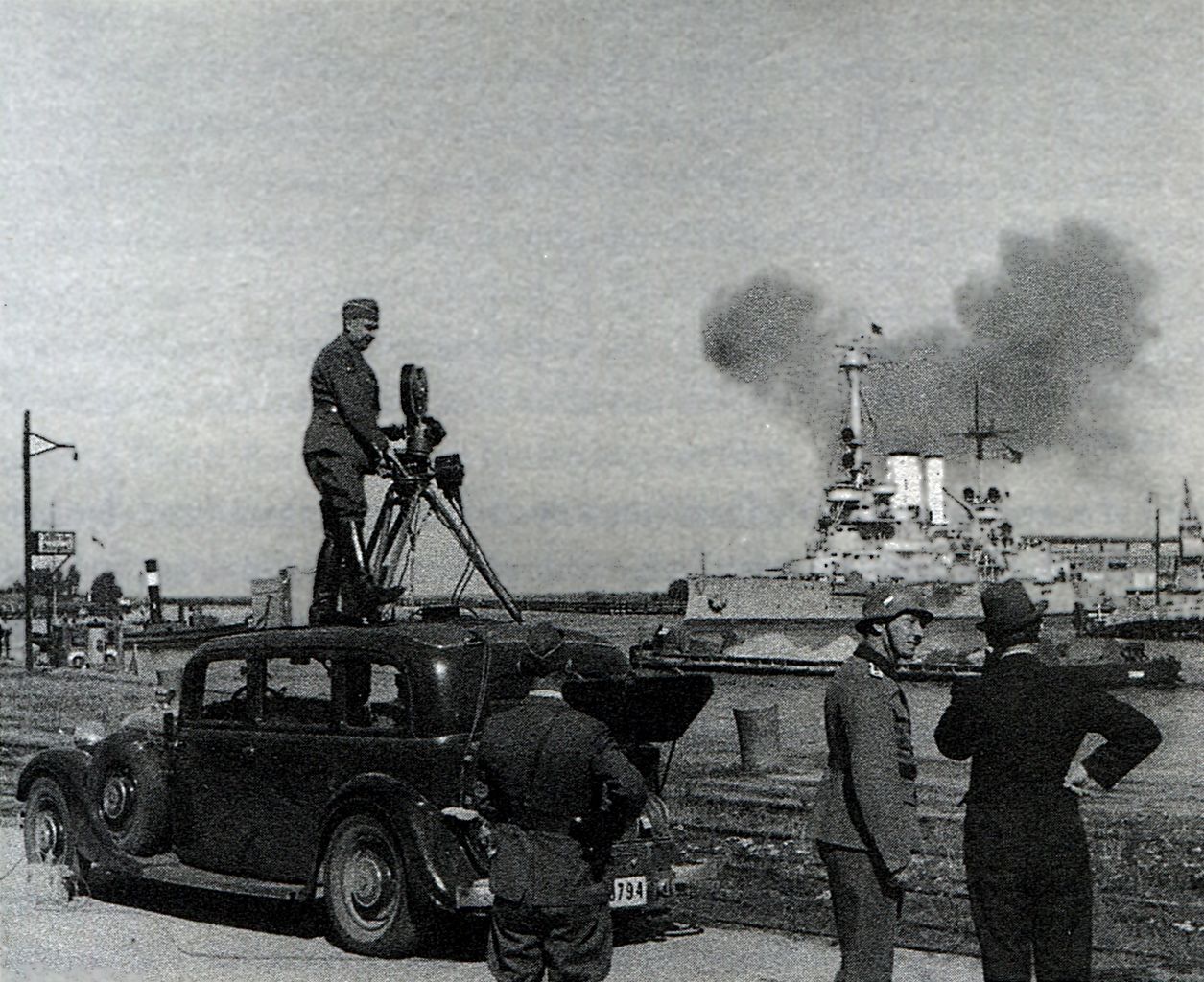 A camera crew filming Schleswig-Holstein's bombardment of Westerplatte