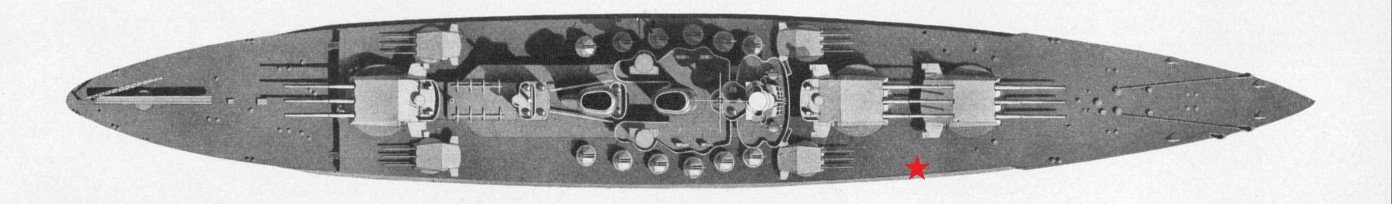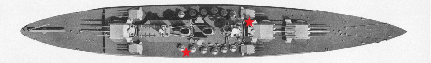 This Fritz X, unlike the ones employed in July and August, worked splendidly. It hit the battleship alongside the second funnel, near the starboard edge of the deck, at about a 70° angle, mostly inboard. The bomb passed through three armor decks, totaling 140mm of steel, and detonated underneath the hull. The aft engine room and two boiler rooms were destroyed, and there was extensive flooding. Power was lost throughout the aft section of the ship, but the crew quickly managed to restore it, as Roma staggered out of the formation.