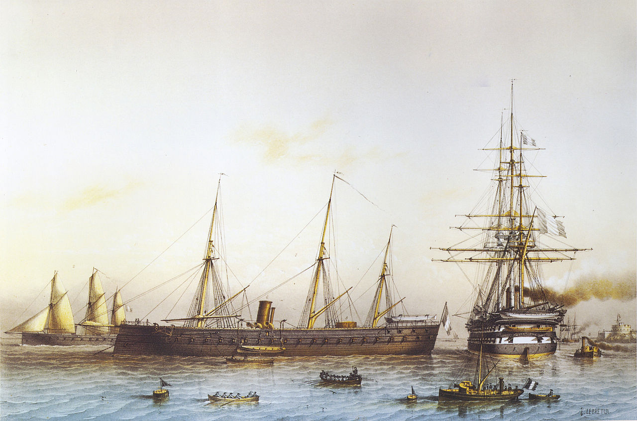 Despite the brief alliance, tensions between the two nations spiked again after the war. The late 1850s saw the French briefly draw even in steam battleships, provoking an invasion scare made worse by the laying down in 1858 of Gloire, the world's first ironclad battleship. However, industrial limitations in France meant that her designer, Dupuy de Lome, although a leading advocate of iron shipbuilding, was forced to build her hull from wood. She was otherwise a fairly conventional vessel, essentially a steam-powered two-decker of the day cut down to a single deck and fitted with 4.5" iron armor. She was to be joined by five other ironclads, one with an iron hull, although this ship, Couronne, was completed after Warrior.
