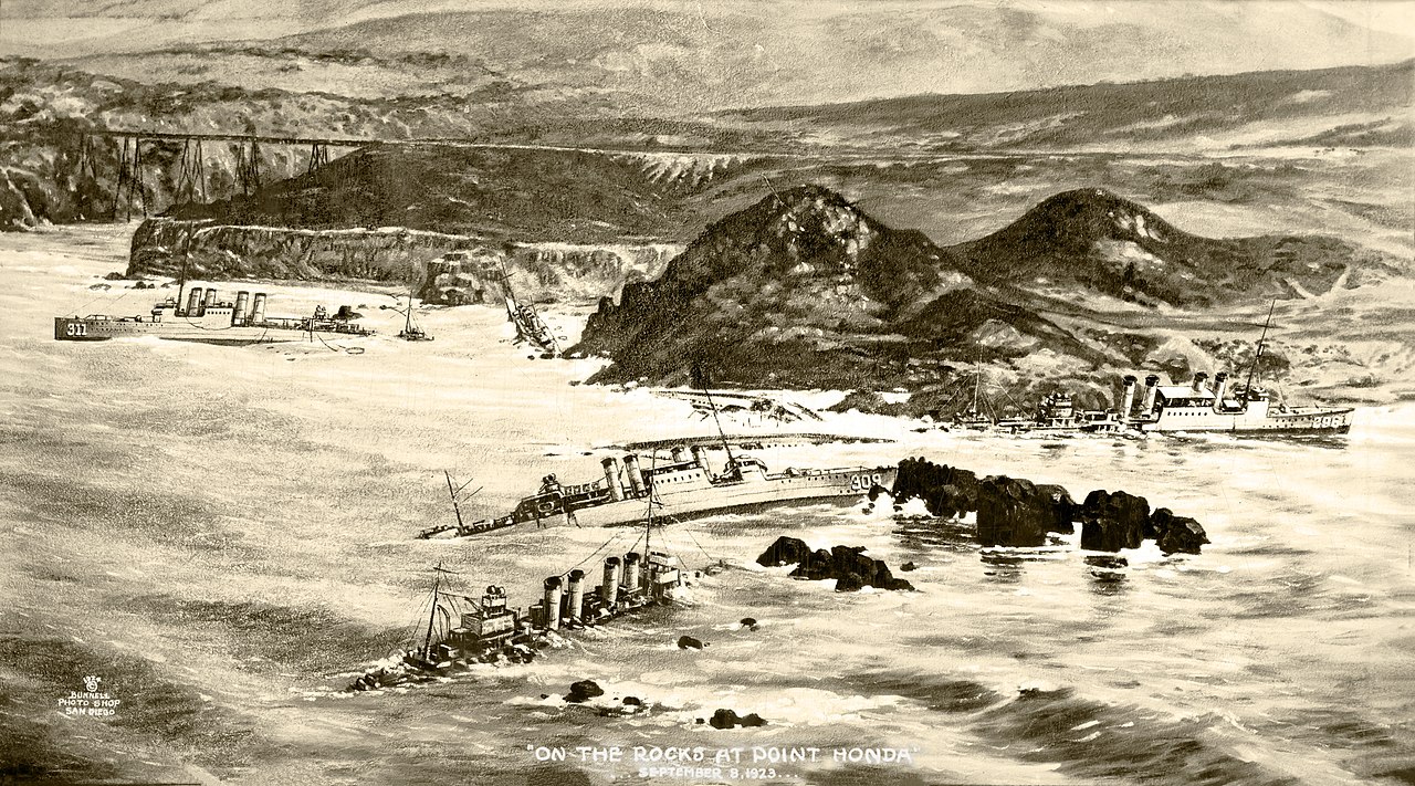 On September 8th, 1923, seven American destroyers ran aground at Honda Point, on the coast of California. It was a foggy night, and the crew of the lead destroyer, Delphy, had gotten confused and thought they were further south than they actually were before turning for the Santa Barbara Channel. And a number of the following destroyers, in line at high speed, followed her onto the rocks. Their crews responded magnificently, and the men from four of the ships - Delphy, S. P. Lee, Young and Chauncey - had managed to get ashore, while a fifth, Nicholas, was in a position where the crew couldn't reach shore safely, and would have to wait out the night. The men who had made it ashore got help from the nearby railroad Section House, and aid was summoned from nearby towns.