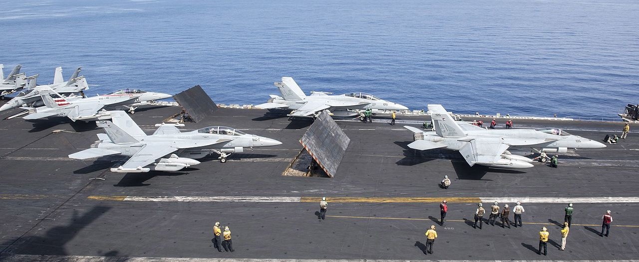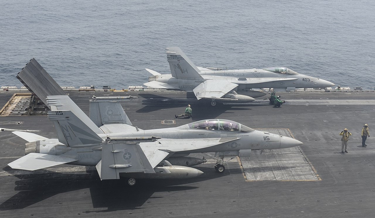 An F/A-18F Super Hornet (front) and an F/A-18C Hornet on the deck of a carrier
