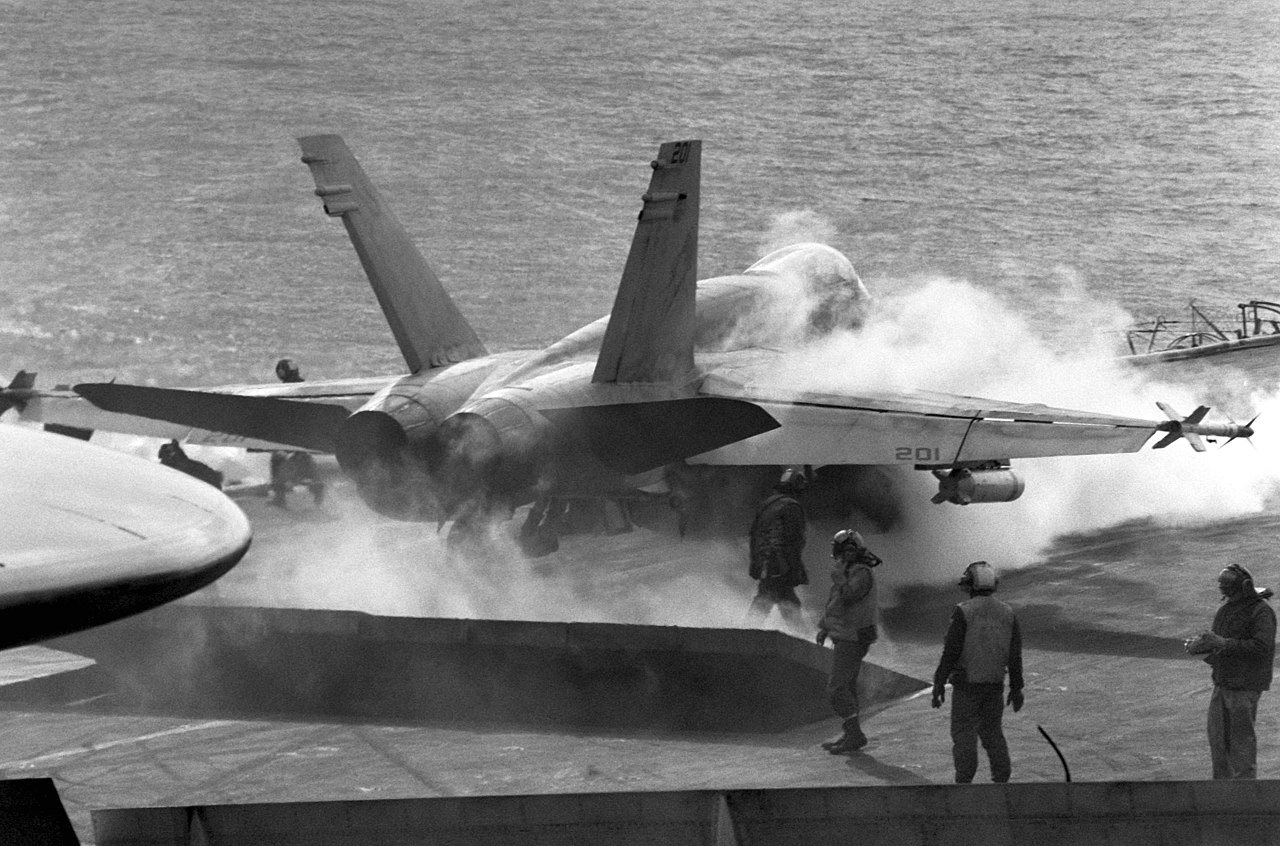 The first F/A-18A rolled out of the McDonnell Douglas factory in St. Louis, Missouri in September 1978, and flew two months later. The flight test program went reasonably well, with the biggest issues discovered being inadequate landing gear, insufficient ailerons, and fatigue cracks in the vertical stabilizer mounts,2 all of which were eventually fixed. The first production Hornets arrived at the training squadron in September 1981, and the first operational squadron, VMFA-314, stood up in January 1983, with the first Navy squadron, V(F)A-113, getting the jet two months later. These early squadrons, which began carrier deployments in 1985, confirmed that the Navy and Marines had a winner on their hands. Particular praise was given to its reliability, which was vastly better than the previous generation of aircraft.
