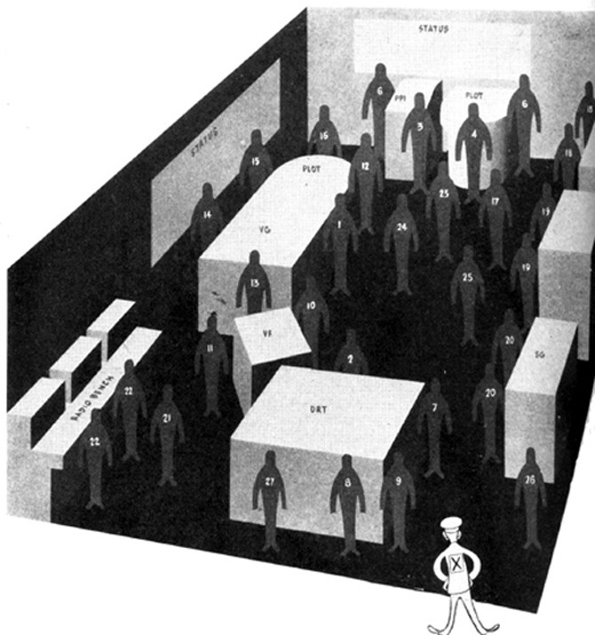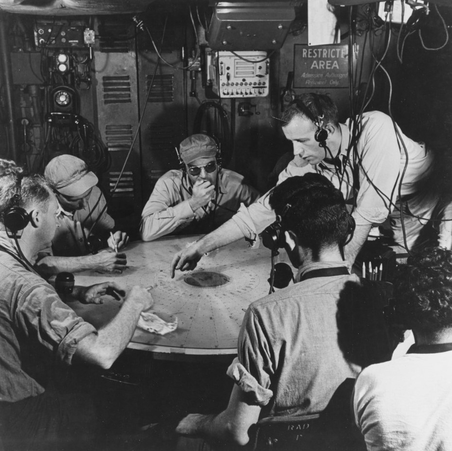 Taking this to sea was somewhat harder. While surface-search radar fitted smoothly into existing plots, air-search radar was somewhat harder to integrate, and the idea of combining tracks from multiple radars as the Dowding System did was out of the question. Between the need for radio silence, the limited bandwidth of existing radio links even when ships weren't being silent, and the problems of plotting tracks another ship reported, ships were initially limited to only working with their own data. However, this was still a massive improvement, and essentially the same techniques were used, with the men on the radar displays calling in tracks over audio circuits,2 which were then plotted by the crew in what was variously known as the Action Information Organization (AIO, British) or Combat Information Center (CIC, American).3 The CIC soon had several plots in it, usually one for the ship's navigation, another for keeping a summary of the surface situation, and a third for the air situation. In addition, radar repeaters, status boards, and men charged with running all of the equipment, evaluating the data, and communicating with the rest of the ship meant that these spaces were very crowded.4
